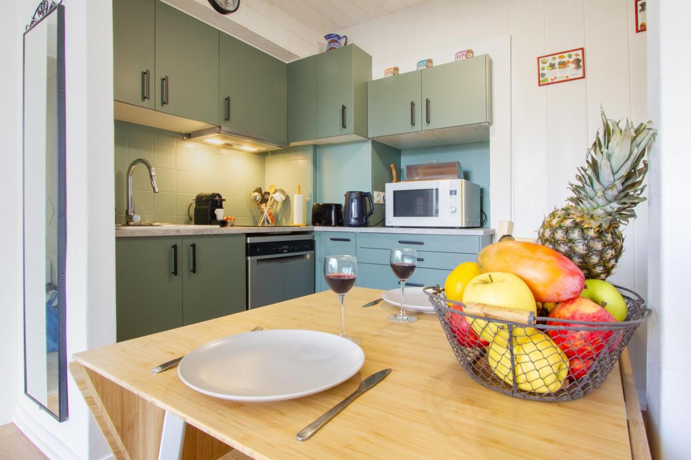 Appartement 1 Chambre. Vous pourrez préparer vos repas et conserver vos aliments dans la cuisine de l’appartement. Cet appartement dispose d’un lave-linge, du chauffage et d’une télévision à écran plat. Ce logement comprend 1 lit.