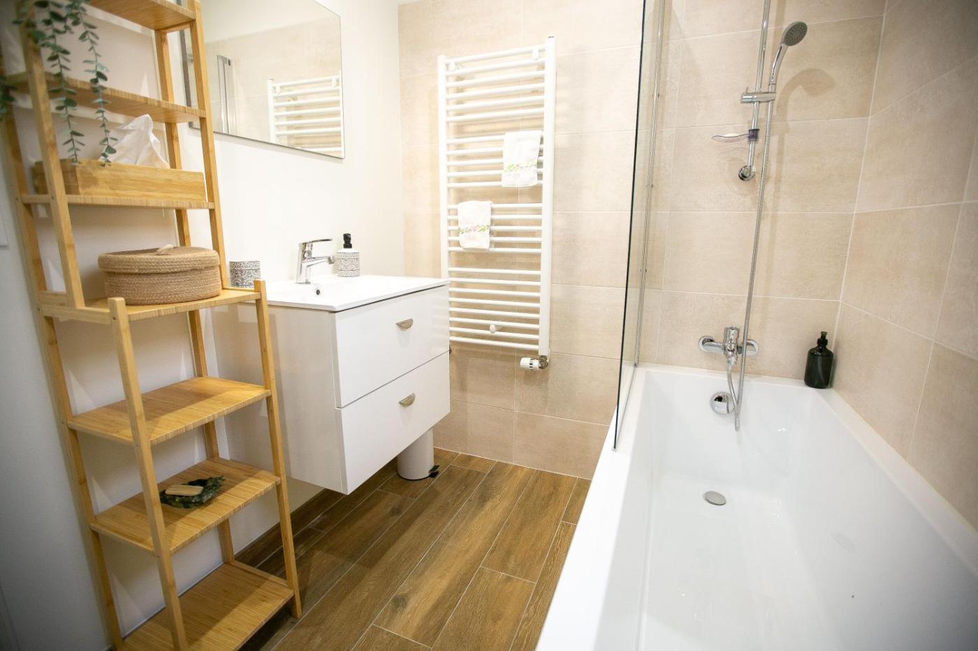 Cet appartement se compose de 3 chambres, dun salon, dune cuisine entièrement équipée avec un réfrigérateur et une machine à café, ainsi que de 2 salles de bains avec une douche et un sèche-cheveux. Des serviettes et du linge de lit sont à votre disposition.