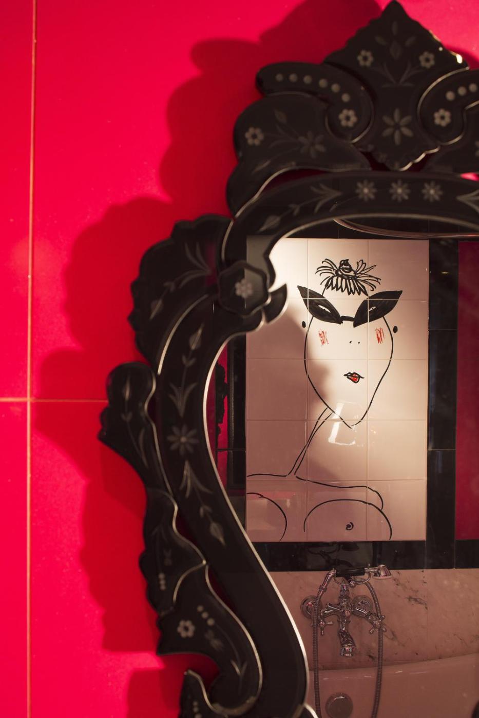 Suite Junior - Cocotte. Décorée en noir et rouge, cette suite offre une vue sur la place du Panthéon. Ce logement comprend une machine à café Nespresso et une salle de bains privative pourvue dune baignoire. ;