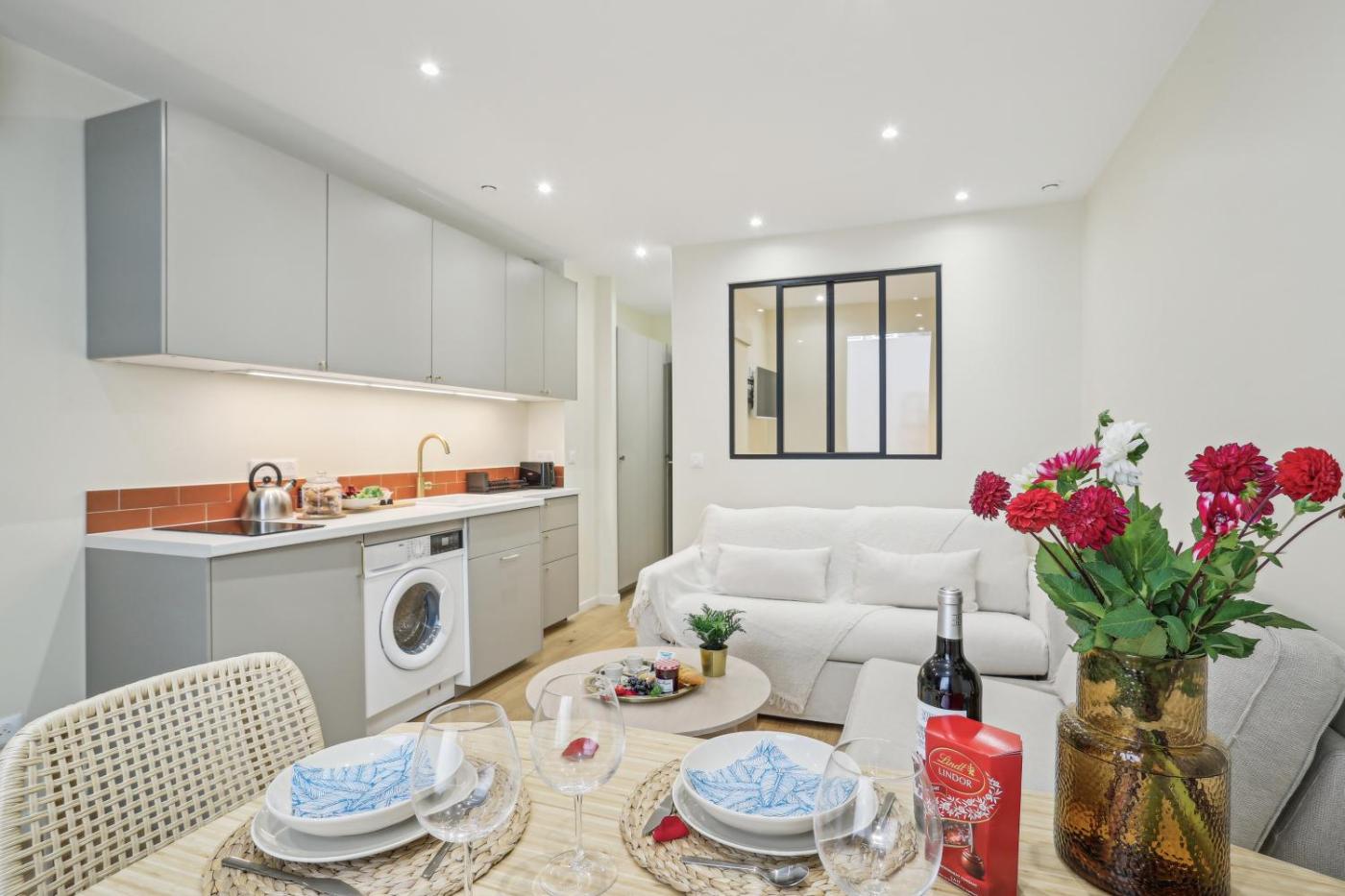 Appartement 1 Chambre. Guests will have a special experience as the apartment provides a hot tub. Featuring a private entrance, this air-conditioned apartment consists of 1 living room, 1 separate bedroom and 1 bathroom with a bath and a shower. In the well-equipped kitchen, guests will find a stovetop, a refrigerator, a dishwasher and kitchenware. The apartment features parquet floors, a seating area with a flat-screen TV, a washing machine, a dining area, as well as a wardrobe. The unit offers 3 beds.
