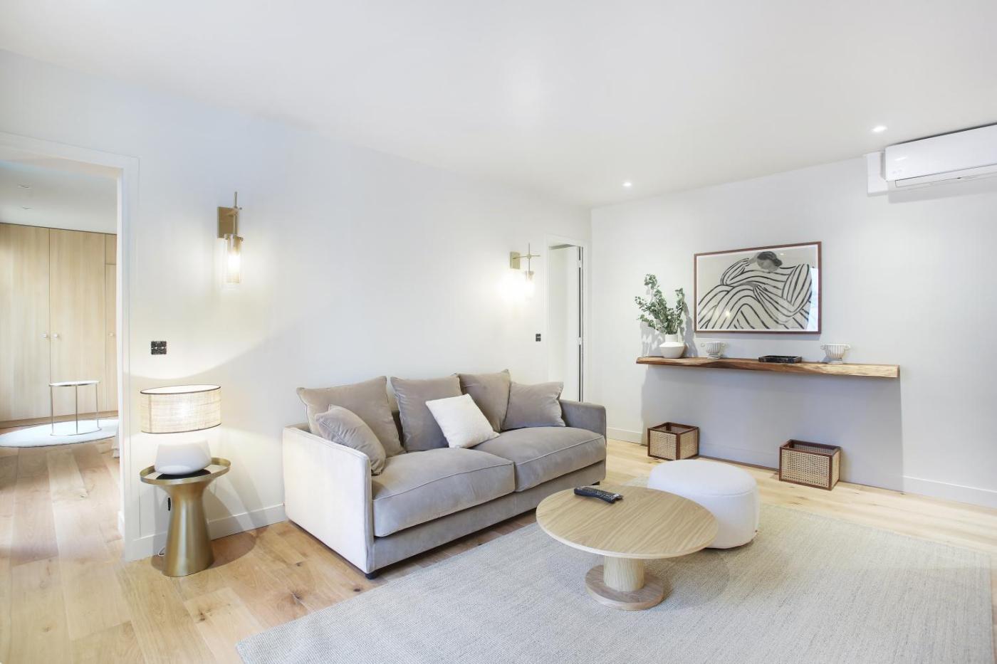 Appartement 1 Chambre. Cet appartement climatisé comprend une entrée privée, un salon, une chambre séparée ainsi qu’une salle de bains avec une douche et un sèche-cheveux. Vous pourrez préparer vos repas dans la cuisine équipée de plaques de cuisson, dun réfrigérateur, d’un lave-vaisselle et d’ustensiles de cuisine. Revêtu de parquet, lappartement dispose dun coin salon avec télévision à écran plat, dun lave-linge, dune machine à café et d’un coin repas. Ce logement comprend 2 lits. ;