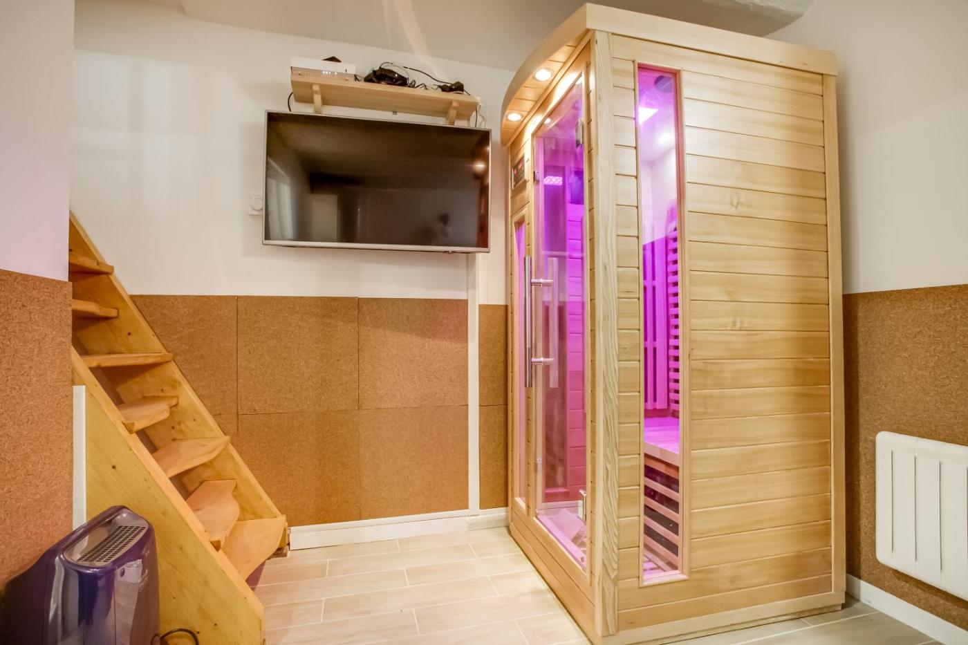 Appartement 1 Chambre. This apartments special feature is the sauna. Featuring a private entrance, this apartment comprises 1 living room, 1 separate bedroom and 1 bathroom with a bath or a shower and a hairdryer. In the well-equipped kitchen, guests will find a stovetop, a refrigerator, a microwave and a tea and coffee maker. The apartment features tiled floors, a seating area with a flat-screen TV, a dining area, a wardrobe, as well as a sofa. The unit offers 2 beds.